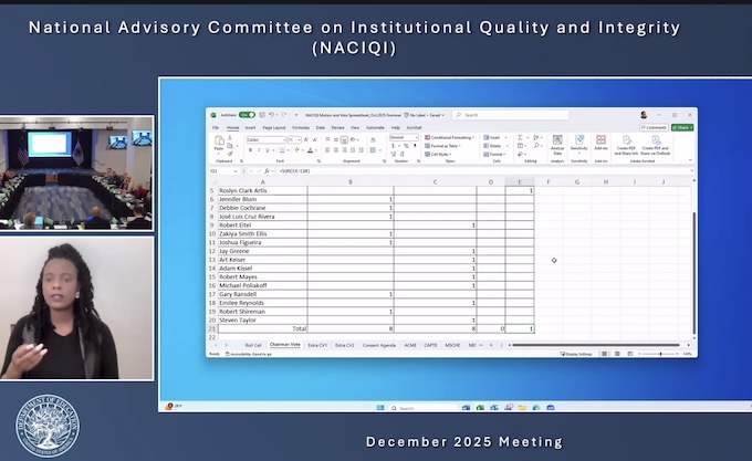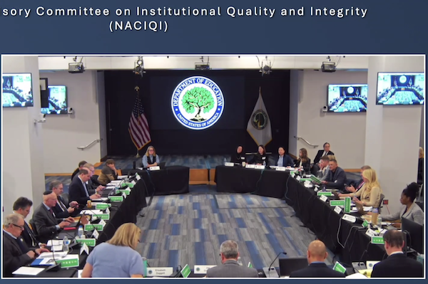 At the opening of today’s meeting of the U.S. Department of Education’s National Advisory Committee on Institutional Quality and Integrity (NACIQI), members of the panel have just reached a tie vote on the selection of a new chair. Zakiya Smith Ellis, a former New Jersey Secretary of Higher Education and NACIQI’s current vice chair, received